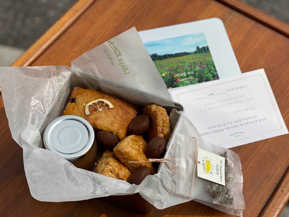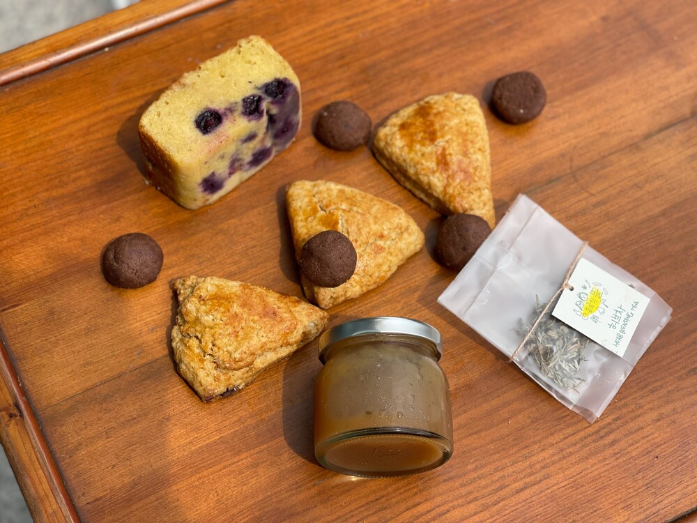 햇 토종밀과 계절 재료로 만든 스콘과 잼, 케이크, 쿠키 그리고 봉금의 뜰의 건강한 여주차 선물세트입니다.
