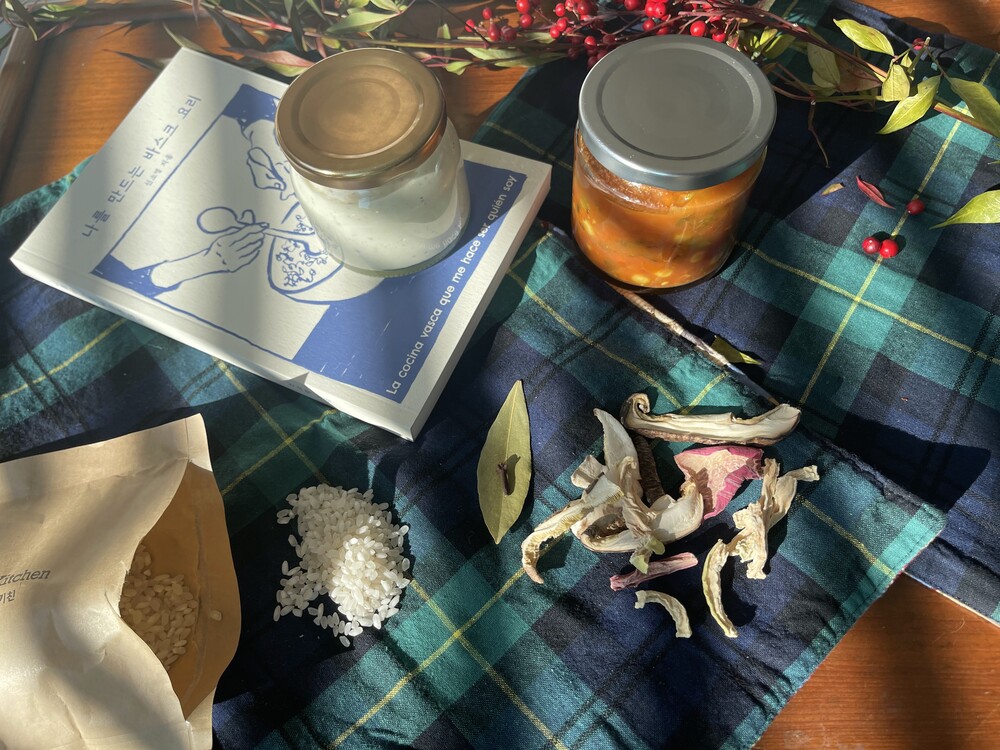 파에야 소스(250ml)와 채수팩 : 유기농 냉이/마늘/울타리콩/무말랭이/보석옥수수/고추/배추(양평 봉금의뜰/팀화요), 무농약 송화고(혜미농원), 무농약 토마토(퇴촌/양평), 무농약 양파/쌀/표고버섯(두레생협), 우엉/파프리카(국내산), 유기농 루케 엑스트라버진올리브유(스페인/올라베르데), 맷돌소금(두레생협), 유기농 간장(양평 가을향기), 사프란/훈연파프리카파우더/허브소금(스페인), 강황/정향/월계수잎(인도), 다시마(2022년산/두레생협)